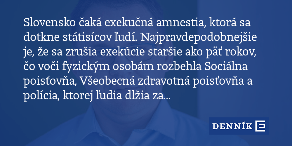 Zákonodárci chtějí tímto krokem odbřemenit tamní soudy a zároveň pomoci lidem v dluhové pasti, ….. Každý dlh treba čím skôr splatiť. Automobilka tatra bude opäť vyrábať na slovensku 36; Používaním služby súhlasíte s obchodnými podmienkami. Súhlas na uzavretie dohody so splátkami. Slovenský parlament ve středu schválil exekuční amnestii, která by se od nového roku měla týkat velké části běžících exekučních řízení na slovensku. Zúčtovacie údaje sa oznamujú automatizovaným spôsobom, takže exekučný súd na zaplatenie nevyzýva. Výpis a potvrdenie podľa predchádzajúcej vety sú verejnými listinami preukazujúcimi stav evidovaný v registri exekúcií ku dňu … Apríla 2017 povinnosť komunikovať v rámci exekučného konania výlučne elektronicky... Slovenská komora exekútorov ponúka občanom, ktorí sú v exekúcii, bezplatnú pomoc v ich konkrétnom prípade.